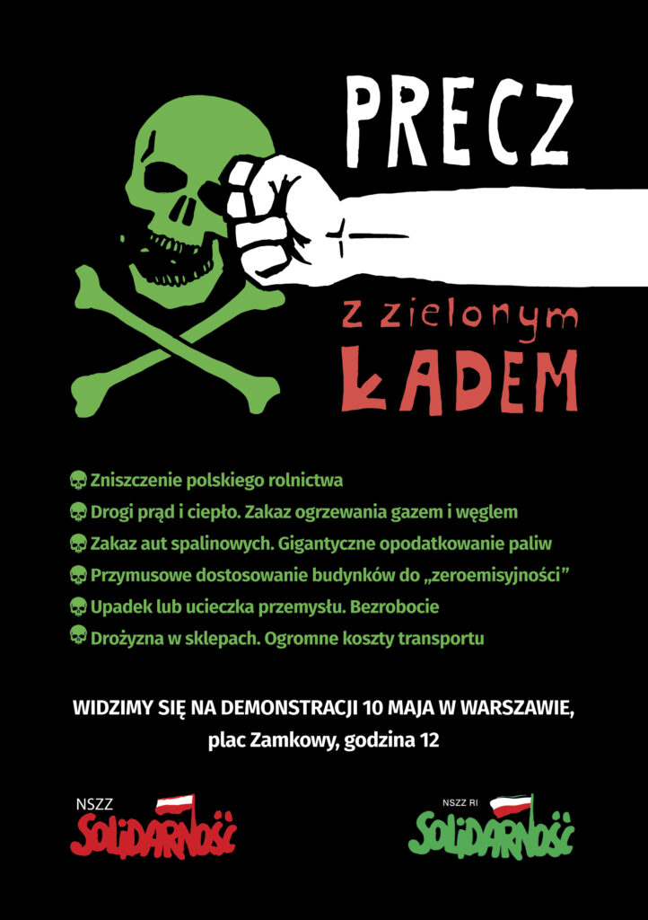 „Rozwiązania wdrażane w ramach Zielonego Ładu w przyszłości przełożą się m.in. na podwyżki opłat za prąd, ciepło, nowe podatki za energię i paliwo, zakaz ogrzewania paliwami kopalnymi, a także wzrostu cen żywności i zagrożenia żywnościowego kraju. NSZZ „Solidarność” postanawia głośno wyrazić swój sprzeciw wobec takiej polityki, organizując protest 10 maja 2024 roku, a podczas tego protestu będziemy domagać się głębokiej rewizji polityki klimatycznej Unii Europejskiej” – czytamy w uchwale Komisji Krajowej.