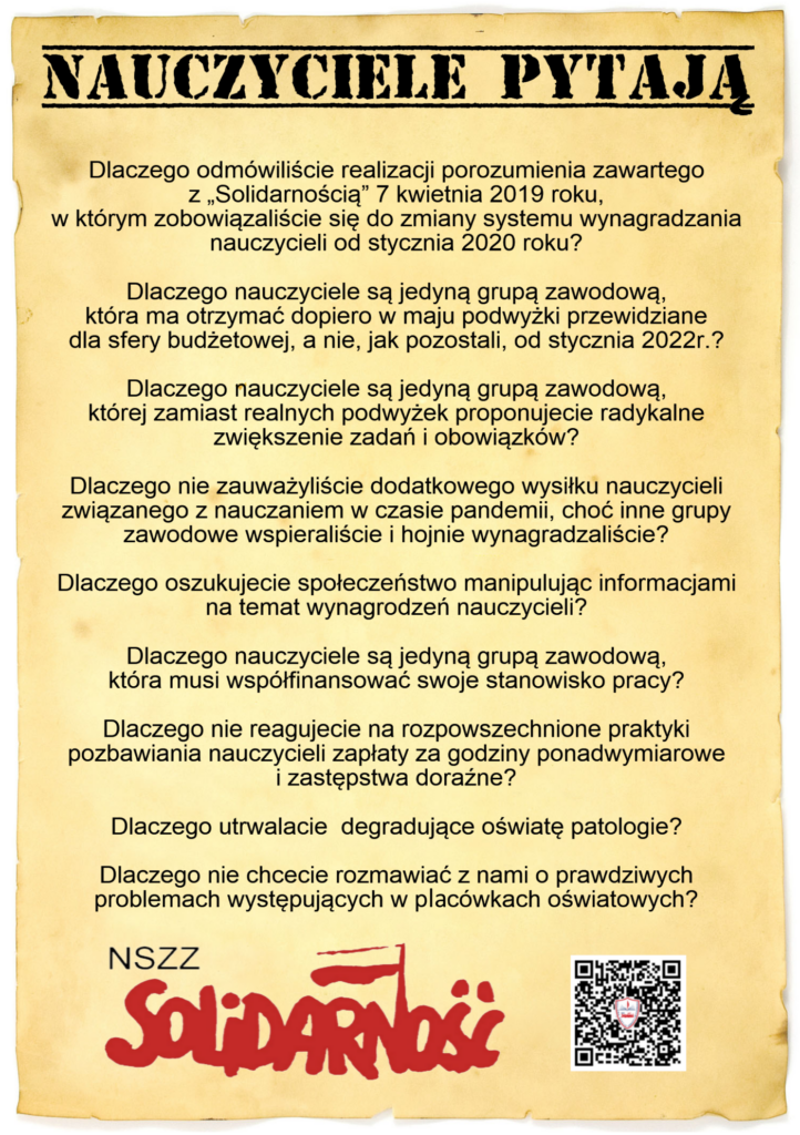 Nauczyciele pytają?!?!? Magdalena Makarska 19 września, 2022 Aktualności Nawigacja wpisu Poprzedni Poprzedni wpis: Komunikat Rady Krajowej Sekcji Oświaty i Wychowania NSZZ „Solidarność” z dn. 01.09.2022r.Następny Następny wpis: STOP KŁAMSTWU I MANIPULACJI MEiN!!