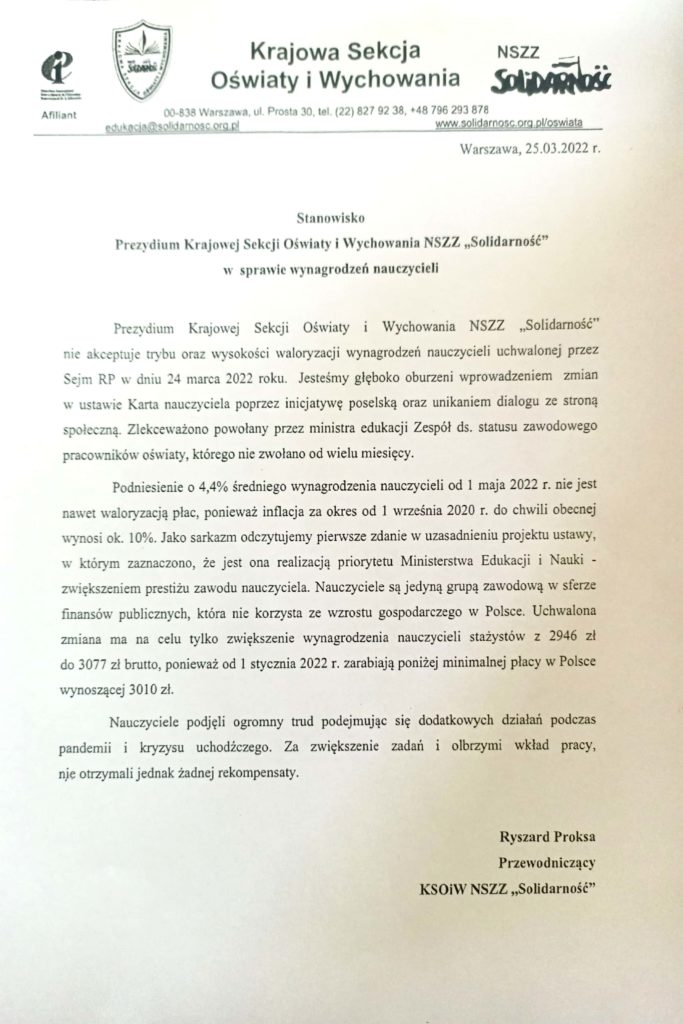 Stanowisko Prezydium Krajowej Sekcji Oświaty i Wychowania NSZZ „Solidarność” w sprawie wynagrodzeń nauczycieli. Magdalena Makarska 25 maja, 2022 Aktualności Nawigacja wpisu Poprzedni Poprzedni wpis: Projekt! Wysokość minimalnych stawek wynagrodzenia zasadniczego od 1 maja.Następny Następny wpis: Wysokość minimalnych stawek wynagrodzenia zasadniczego nauczycieli.