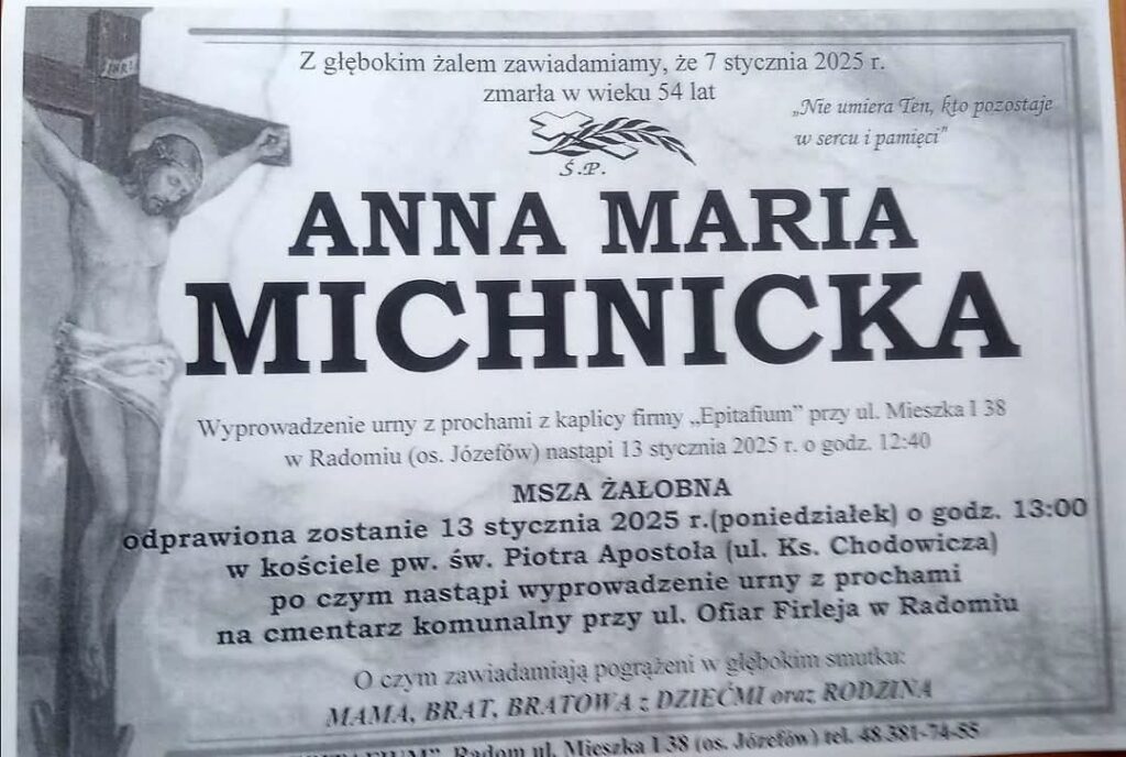 Z przykrością zawiadamiamy, że po bardzo ciężkiej chorobie zmarła Anna Michnicka, nauczycielka polonistka pracująca w PSP34 w Radomiu. P. Anna była wieloletnią członkinią „Solidarności”.